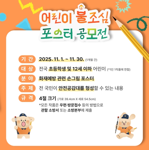 [뉴스앤톡] 해남소방서가 11월 불조심 강조의달을 맞아 이달 21일까지 지역 내 초등학생 및 12세 이하 어린이를 대상으로 불조심 포스터 공모전을 개최한다.