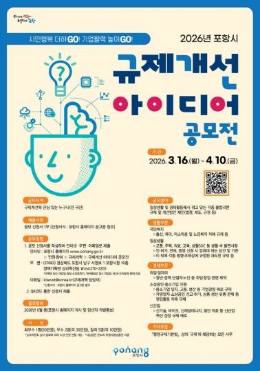 [뉴스앤톡] 포항시는 일상생활과 경제활동에 불편을 주는 불합리한 규제를 시민과 함께 발굴하고 개선하기 위해 3월 16일부터 4월 10일까지 ‘2026년 포항시 규제개선 아이디어 공모전’을 개최한다.