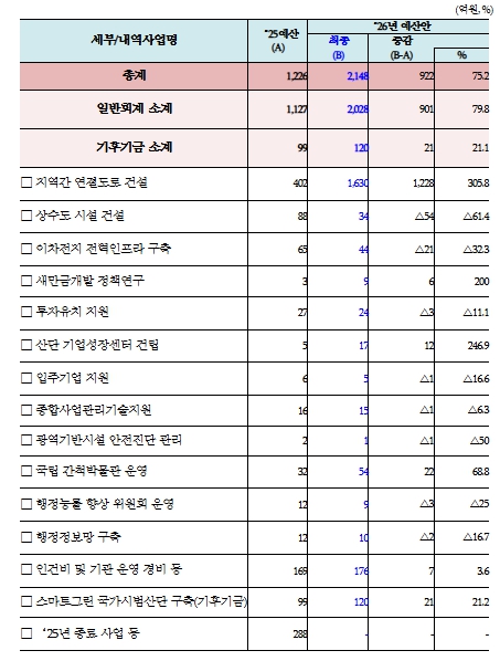 [뉴스앤톡] 새만금개발청 2026년 예산이 지난해 대비 75.2%(922억원) 증가한 2,148억원으로 2025년 12월 2일 국회 본회의에서 의결·확정됐다.
