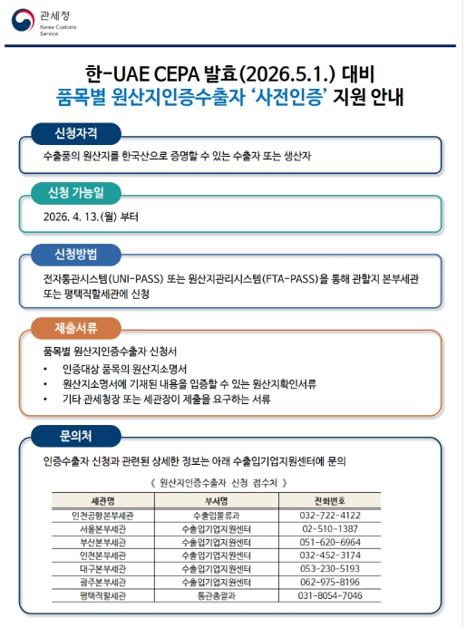[뉴스앤톡] 관세청은 오는 5월 1일 발효되는'한-아랍에미리트연합국(UAE) 포괄적경제동반자협정(CEPA)'를 우리 수출기업들이 발효 첫날부터 즉시 활용할 수 있도록, 4월 13일부터 품목별 원산지인증수출자 ‘사전인증’ 신청·접수를 시작했다.