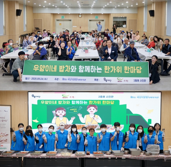 [뉴스앤톡] 하남시종합사회복지관은 24일 복지관 4층 대강당에서 ‘우양이네 밥차와 함께하는 한가위 한마당’을 개최했다. 우양재단과 본죽의 후원, ‘2층에 사진관’의 재능기부로 진행됐으며, 명절을 앞두고 사회적 고립이 우려되는 저소득 어르신 60명을 초청해 한가위 점심과 명절 선물, 장수사진 촬영 서비스를 제공했다.
