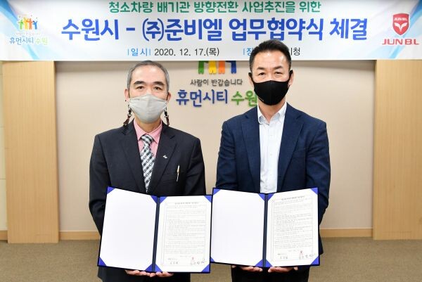 수원시와 ㈜준비엘은 17일 수원시청 귀빈실에서 ‘청소 차량 배기관 방향 전환 사업을 위한 업무협약’을 체결했다.