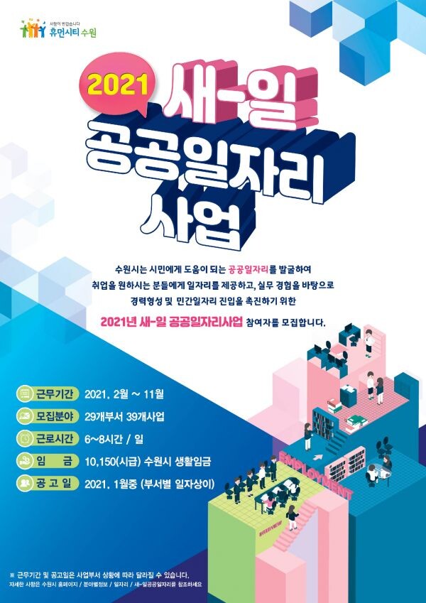수원시 일자리정책과 관계자는 “이번 ‘새-일 공공일자리사업’이 코로나19로 취업난을 겪고 있는 시민들에게 조금이나마 도움이 되길 바란다”고 말했다.