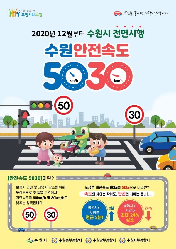 수원시 관계자는 “안전속도 5030 정책의 시행 초기인 만큼 일부 혼란이 있을 수도 있지만, 교통문화 정착을 위해 가족의 안전을 지킨다는 마음으로 시민들의 적극적인 관심과 협조를 요청드린다”고 말했다.