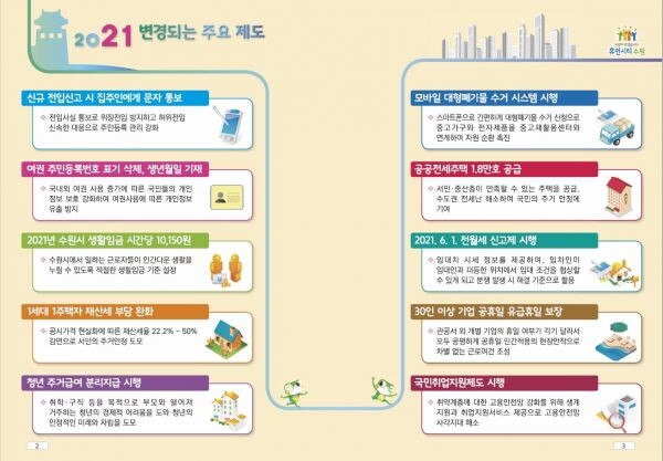 수원시가 새해 달라지는 수원시·정부 제도를 설명한 책자 ‘2021 새롭게 달라지는 제도’를 제작했다.