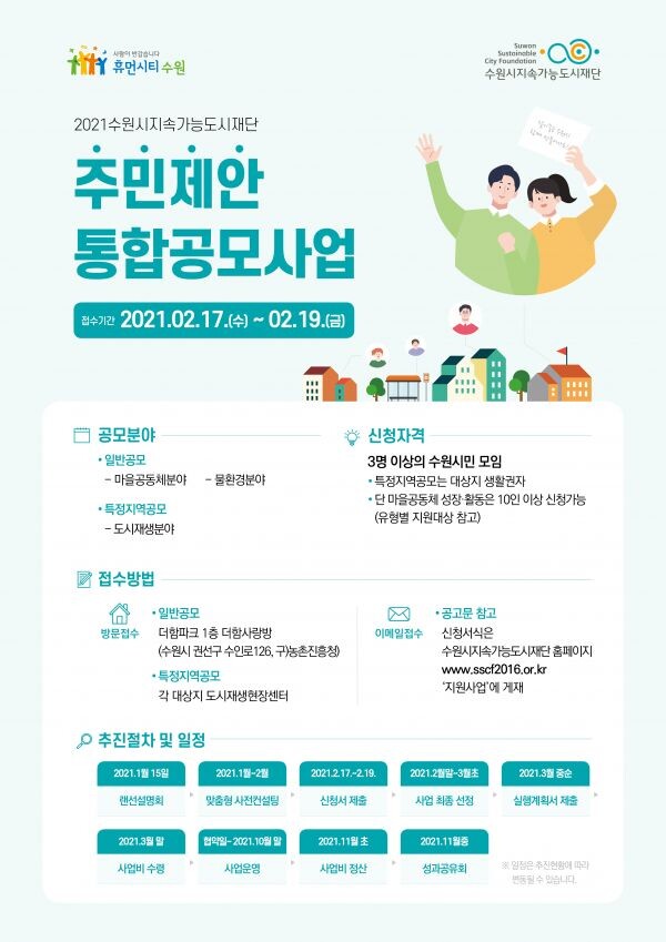 수원시지속가능도시재단 홈페이지 ‘지원사업 공고’에 게시된 ‘2021 주민제안 통합공모사업 공고’에서 자세한 내용을 확인할 수 있다.