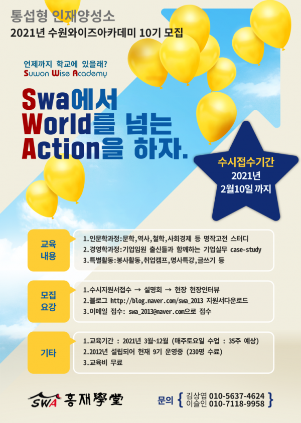 수원와이즈아카데미는 기업과 사회가 원하는 리더십과 품성, 역량을 갖춘 ‘통섭형 인재’를 양성하는 교육 프로그램’이다.