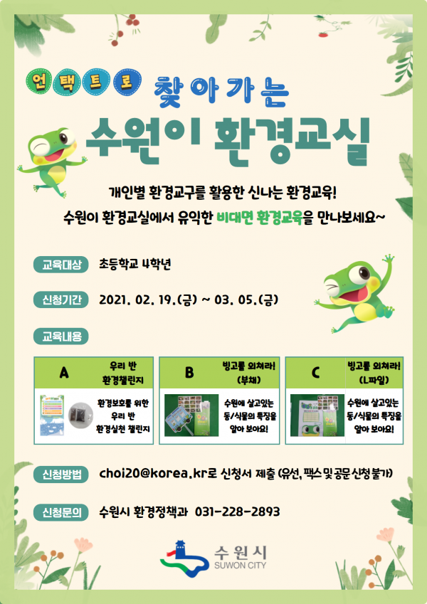 ‘언택트로 찾아가는 수원이 환경교실’은 양치컵 쓰기·재활용품에 해바라기 심어보기 등 매달 제시된 임무를 수행하며 학급별로 환경보호 운동을 실천해보는 ‘우리 반 환경 챌린지’, 수원에 사는 동·식물 등을 주제로 빙고 게임을 하는 ‘빙고를 외쳐라’ 등으로 구성된다.