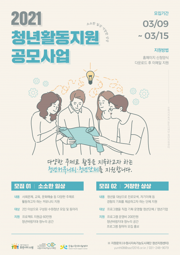 소소한 일상은 사회문제, 교육, 문화예술, 취·창업 등 다양한 주제로 활동 하고 있는 2인 이상으로 구성된 수원청년 모임 및 동아리를 지원한다.