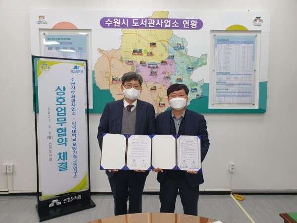 수원시 도서관사업소와 단국대학교 교양기초교육연구는 9일 오후 2시 선경도서관 1층 강의실에서 교류 협력을 약속하는 협약을 체결했다.