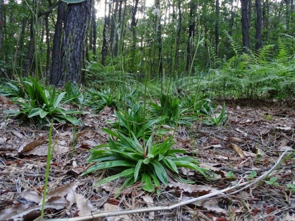 피침형의 잎 10여 장이 뿌리에서 나와 사방으로 퍼지며 6~7월 경 노란빛이 도는 꽃이 핀다.
