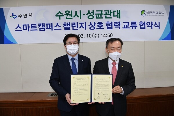 수원시와 성균관대학교는 10일 장안구 성균관대 자연과학캠퍼스 부총장실에서 ‘스마트시티 활성화 및 협력체계 구축을 위한 협약’을 체결했다.