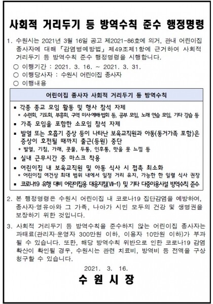 수원시는 어린이집 집단감염 확산을 예방하기 위해 ‘감염병의 예방 및 관리에 관한 법률’ 제49조 제1항에 따라 행정명령을 내렸다.
