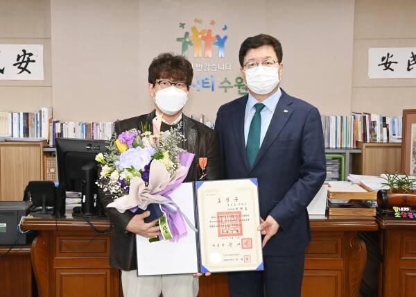 염태영 수원시장은 18일 집무실에서 이병호 주무관에게 근정포장 : 공무원 및 사립 학교의 교원과 국·공영 기업체·공공 단체 또는 사회단체의 직원으로서 직무에 힘써 국리민복에 기여한 공적이 뚜렷한 사람에게 주는 포장. 근정포장을 전수했다.