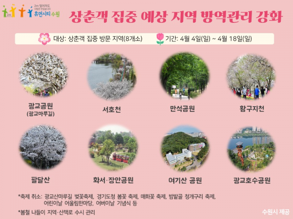 광교공원 서호천 만석공원 황구지천 팔달산 화서·장안공원 여기산공원 광교호수공원 등 봄철 나들이객이 많이 찾는 8개소가 대상이다.