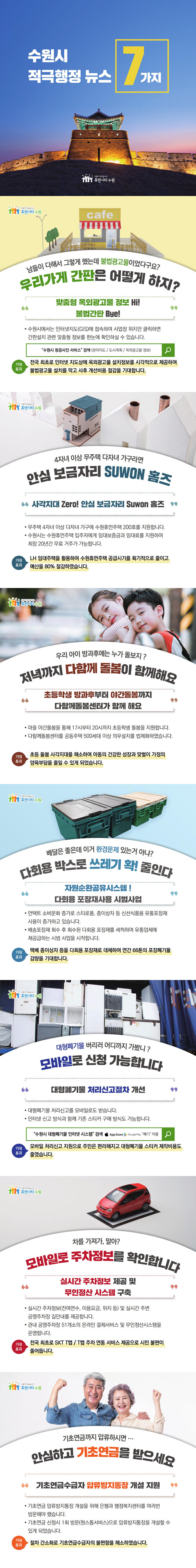 카드뉴스로 소개한 적극행정은 ‘전국 지자체 최초 1회용 대신 다회용 박스 배송으로 쓰레기 확 줄인다’를 비롯해 맞춤형 옥외광고 정보 제공으로 불법간판 줄인다 ‘초등학생 방과 후부터 야간 돌봄까지’ 마음 돌봄이 함께해요, 실시간 주차정보 제공, 무인정산 시스템 구축, 사각지대 Zero 안심 보금자리 Suwon 홈즈, 대형폐기물 처리 신고 절차 개선, 기초연금 수급자 압류방지통장 개설 지원 등이다.