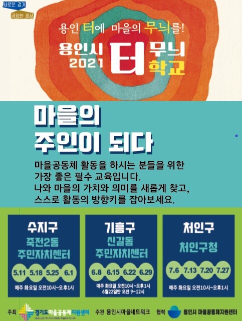 교육에는 처인·기흥·수지 등 각 구별로 25명씩 총 75명이 참여할 수 있으며 현재 시 마을공동체지원센터에서 모집하고 있다.