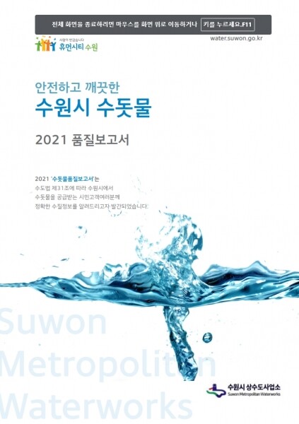 수원시는 ‘안전하고 깨끗한 수원시 수돗물 2021 품질보고서’를 수원시 홈페이지와 상수도사업소 홈페이지에 게시해 시민 누구나 확인할 수 있도록 했다.