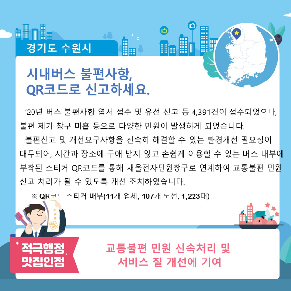 행정안전부는 최근 수원시의 ‘포장폐기물 감축을 위한 다회용 수송 포장재 시범사업’·‘시내버스 불편사항 큐알코드로 신고하세요’를 비롯한 6건을 ‘지자체 적극행정 맛집’으로 선정했다.