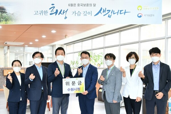 호국보훈의달을 맞아 수원시 보훈복지시설 중 하나인 보훈요양원을 찾은 조청식 제1부시장은 김정면 보훈요양원장과 간담회를 하고 위문금을 전달했다.