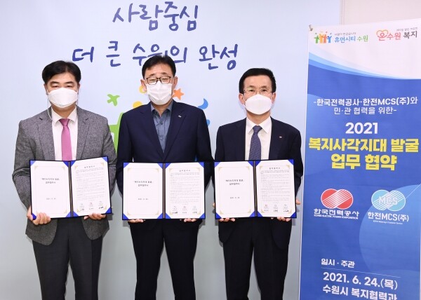 수원시는 24일 시청 복지여성국장 집무실에서 한국전력공사 서수원지사, 한전MCS 서수원지점과 ‘복지사각지대 발굴 업무협약’을 체결하고 협력을 약속했다.