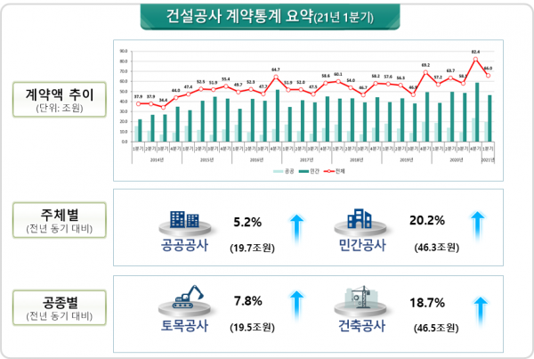 ‘21.1분기 국가·지자체·공공기관 등이 발주하는 공공공사 계약액은 19조 7천억원으로 전년 동기 대비 5.2% 증가했고 민간부분은 전년 동기 대비 20.2% 증가한 46조 3천억원을 기록했다.