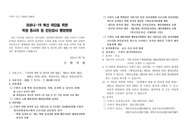 행정명령 대상은 수원시 소재 학원의 강사·직원·운전원 등 모든 학원 종사자와 체육시설로 관리되는 체육입시학원 종사자다.