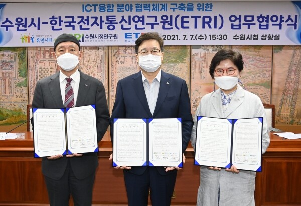 수원시와 ETRI, 수원시정연구원은 7일 수원시청 상황실에서 ‘ICT 융합 분야 협력체계 구축을 위한 업무협약’을 체결하고 협력을 약속했다.