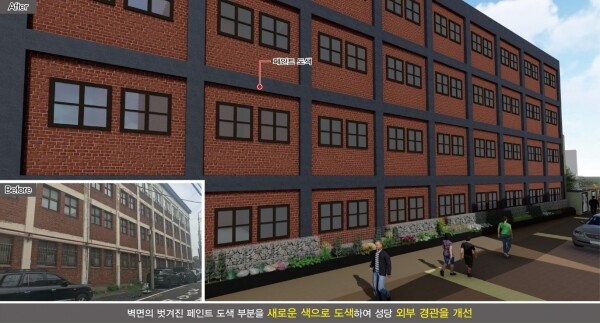 북수동성당 내 ‘뽈리화랑’ 건물 뒤쪽 벽은 페인트를 칠하고 줄눈을 보수해 산뜻하게 단장한다.