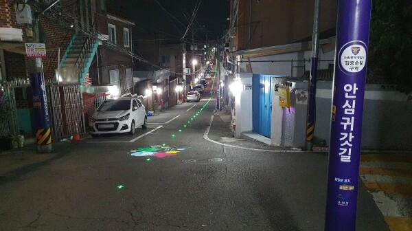 로고젝터를 이용해 어두운 골목길에 ‘경찰집중순찰구역’·‘함께 만들어요. 범죄 없는 희망도시’와 같은 문구와 꽃 이미지 등을 원색으로 투영하고 차도와 보도 구분이 없는 이면도로에는 쏠라도로표지병을 설치해 거리를 한결 밝게 만들었다.