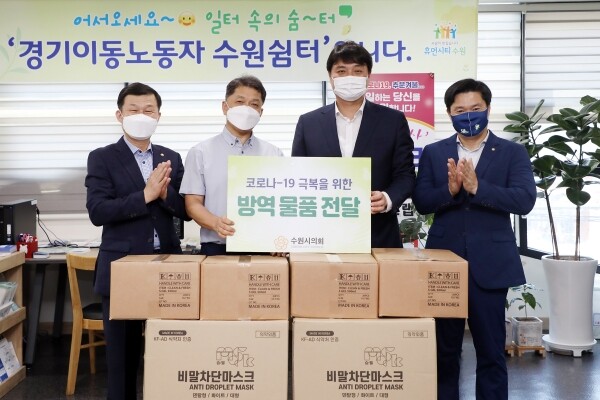 이날 조석환 의장과 최찬민 더불어민주당 대표, 한원찬 국민의힘 대표는 경기이동노동자 수원쉼터와 수원다시서기 노숙인종합지원센터를 찾아 마스크 1만장과 손 소독제 200개를 각각 전달했다.