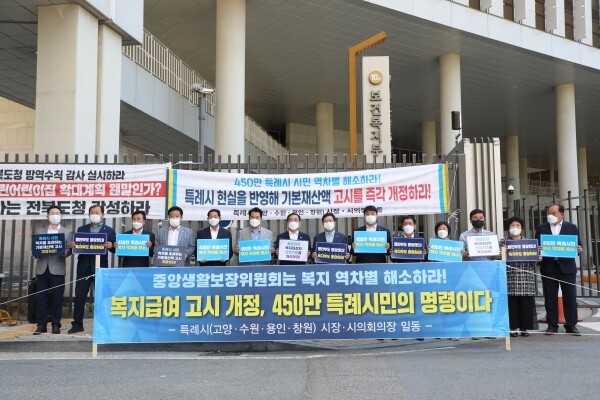 이들은 “중앙생활보장위원회는 특례시 현실을 반영해 기본재산액 고시를 즉각 개정하라”며 “복지급여 고시 개정은 450만 특례시민의 명령”이라고 목소리를 높였다.