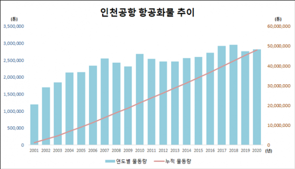 ‘01년 120만 톤이였던 인천공항 항공화물 물동량은 매년 실적이 점차 개선되면서 ’07년 255만 톤까지 기록했으나 ’08년 미국 금융위기 여파로 물동량이 ‘09년 231만 톤까지 하락 후 전세계 경기가 점차 회복되면서 ‘18년에는 개항 후 최고 실적인 295만 톤을 달성하는 등 소폭의 등락을 거듭하면서도 전반적인 실적은 상승 추세에 있다.