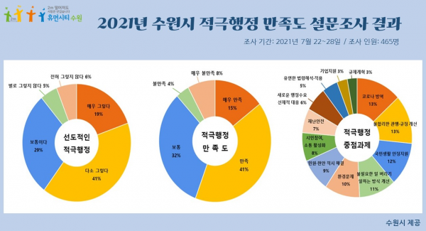수원시의 적극행정에 대한 시민체감도 및 만족도를 확인하기 위한 이번 설문에는 시민 465명이 온·오프라인을 통해 참여했다.