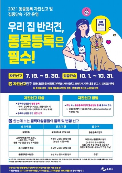수원시는 10월 1일부터 31일까지 ‘동물등록 집중 단속 기간’을 운영해 동물등록을 하지 않은 이들에게 과태료를 부과할 예정이다.