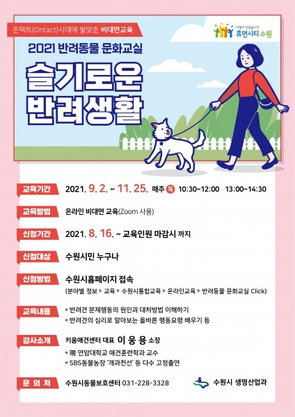 [뉴스앤톡] 수원시가 2021년 반려동물 문화교실 ‘슬기로운 반려생활’에 참여할 수강생을 선착순으로 모집한다.