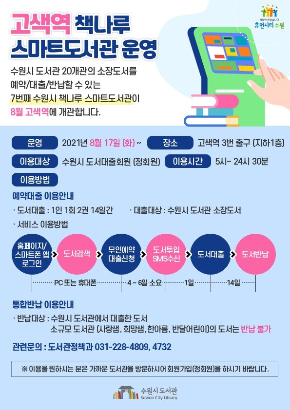 수원시 도서관 관계자는 “고색역 책나루 스마트도서관 개관으로 서수원지역 주민들이 한결 편리하게 도서를 대출하고 반납할 수 있을 것”이라며 “시민들의 도서관 이용 만족도가 더 높아지길 바란다”고 기대했다.