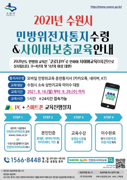 이수 대상 민방위 대원은 PC나 스마트폰으로 민방위 사이버교육 홈페이지에 접속하거나 수원시 홈페이지에서 민방위 사이버 교육 배너를 클릭해 수강할 수 있다.