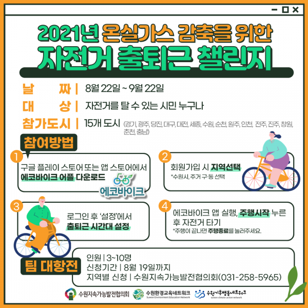 자전거 이용을 활성화해 온실가스와 미세먼지 등을 줄이기 위한 이번 행사에는 자전거를 이용하는 수원시민 누구나 참여할 수 있다.
