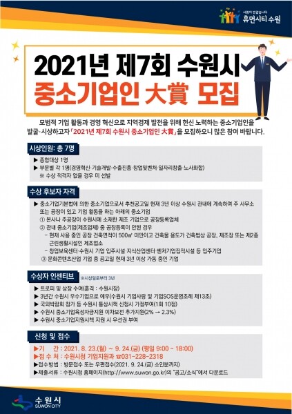 수원시 홈페이지 ‘공고/고시/입법예고’에 게시된 ‘2021년 제7회 수원시 중소기업인 대상 선정 계획 공고’에서 제출서류 서식을 내려받아 23일부터 9월24일까지 수원시청 기업지원과에 방문·우편 신청해야 한다.