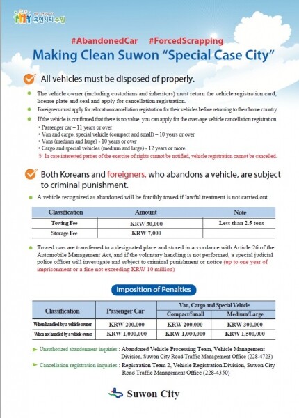 수원시 도로교통관리사업소 관계자는 “자동차를 적법하게 처리하는 방법과 외국인도 무단방치를 하면 형사처벌의 대상이라는 사실을 홍보해 차량 무단방치 행위에 대한 경각심을 높일 것”이라며 “외국어 홍보로 외국인들의 자동차 무단 방치가 줄어들길 바란다”고 말했다.