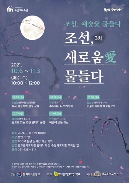 관심 있는 시민은 오는 8일부터 광교홍재도서관 홈페이지 ‘통합예약/신청→독서문화프로그램’에서 ‘조선, 예술愛 물들다: 3차 조선, 새로움愛 물들다’를 선택해 신청하면 된다.