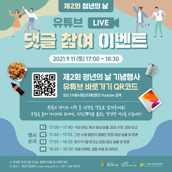 기념행사는 청년 정책 토크쇼 ‘방구석 1열’, 환경보호 실천 캠페인 ‘그린 수원 챌린지’, ‘유튜브 댓글 이벤트’ 등의 프로그램으로 진행된다.