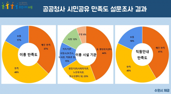 수원시가 8월 26일부터 9월 19일까지 수원시청 홈페이지와 시·구·동 민원실에서 진행한 ‘공공청사 시민공유 만족도 설문조사’에서 응답자의 83%가 “시민공유 서비스에 전반적으로 만족한다”고 답했다.