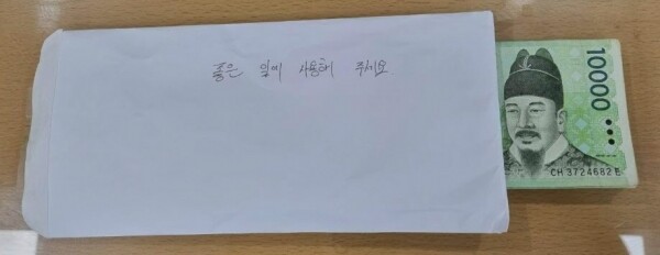 봉투 입구는 투명테이프로 봉했고 겉면에는 ‘좋은 일에 사용해 주세요’라는 문구가 적혀있었다.