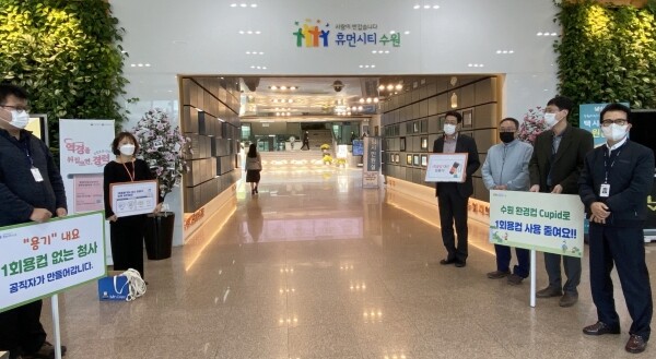수원시청 청소자원과 직원들이 점심시간에 공직자들을 대상으로 ‘일회용품 없는 청사 만들기’, ‘수원 환경컵과 같은 다회용 컵 사용하기’ 등을 적극적으로 홍보한다.