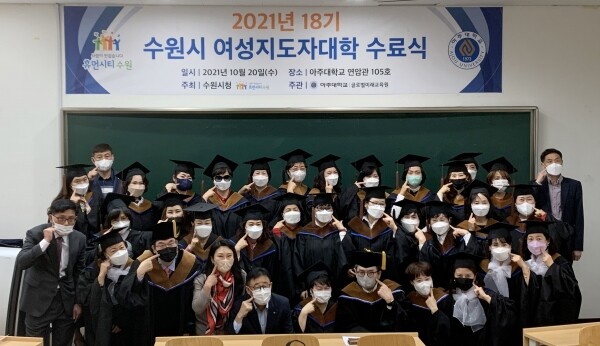 아주대학교 글로벌미래교육원이 주관한 ‘수원시 여성지도자대학’은 여성의 사회참여 확대와 리더십·역량을 강화하기 위한 여성 인재 양성 프로그램으로 지난 6월 30일부터 10월 20일까지 매주 수요일 운영됐다.