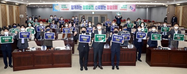 수원시의회는 21일 362회 임시회 제2차 본회의 산회 후, 시의회 의원 전원이 참석한 가운데 청렴 실천 다짐 캠페인을 실시했다면서 이같이 밝혔다.