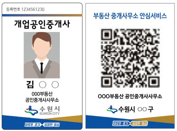 수원시는 10월 초부터 부동산 중개를 의뢰한 시민들이 공인중개사 자격 여부·등록 현황 등을 확인할 수 있도록 공인중개사가 패용하는 명찰과 중개 사무소 입구에 부착할 수 있는 큐알코드 스티커를 제작했다.