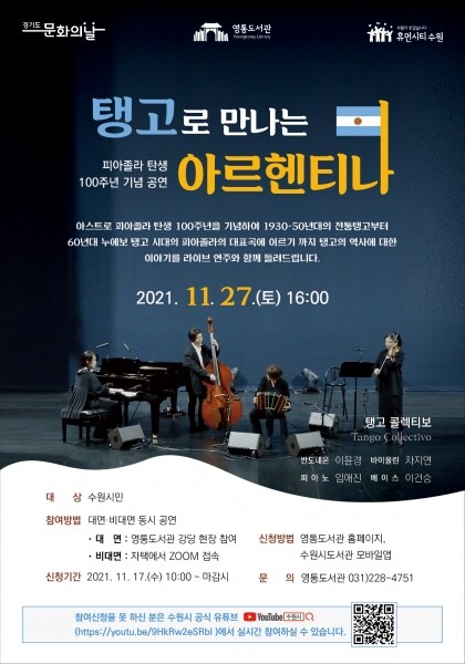 공연은 영통도서관 강당에서 바이올린·피아노·베이스·반도네온 연주가로 구성된 공연팀 ‘탱고 콜렉티보’가 1시간 동안 진행할 예정이다.